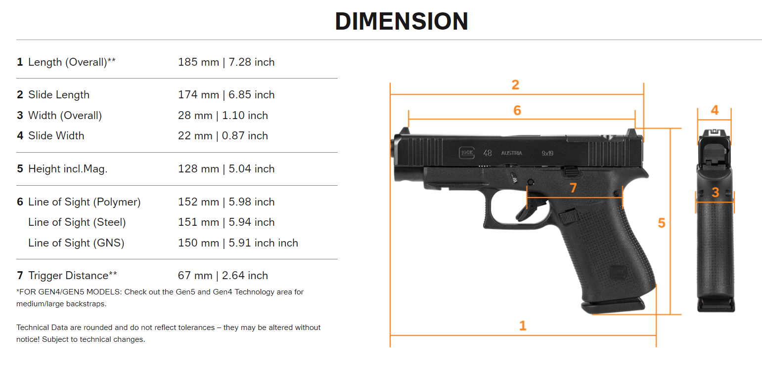 בעל אורך וגובה זהה לזה של הגלוק 19, אבל בעל פרופיל צר, המאפשר נוחות ויכולת הסלקה, מבלי להתפשר על איכות.