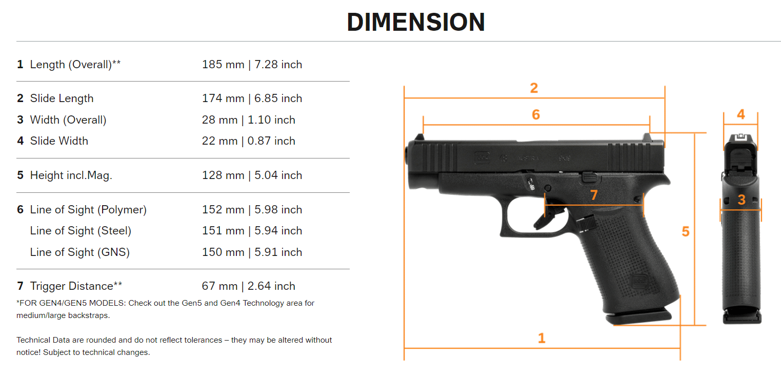 בעל אורך וגובה זהה לזה של הגלוק 19, אבל בעל פרופיל צר, המאפשר נוחות ויכולת הסלקה, מבלי להתפשר על איכות.